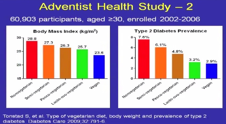 Wygląda to jak schodki. Im większa jest rezygnacja z produktów odzwierzęcych tym mniejsza waga ciała i mniejsze ryzyko cukrzycy. Bardzo polecam przejście na drugi stopień. Semiwegetarianie. Kilku moich znajomych ograniczyło mięso do jednego czy dwóch dni w tygodniu i bardzo takie rozwiązanie chwali. Ja sam byłem semiwegetarianinem przez wiele lat. Potem są pescawegetarianie, czyli ci, co jedzą ryby. Potem są lactoowowegetarianie, czyli ci, co jedzą nabiał, ja tu obecnie stoję. Potem są weganie. Odnośnie produktów odzwierzęcych wkładanych do naszych otworów gębowych i cukrzycy to wniosek jest jeden: im mniej tym lepiej. Podobno wnioski są przy większości innych chorób. W tabelce jest jeszcze jedna bardzo ciekawa rzecz. Uważa się, że od BMI na poziomie 25 zaczyna się nadwaga. Wśród ludzi powyżej 30 roku życia, tylko weganie są poniżej nadwagi i mieszczą się w normie. Jednak ciekawe jest to, że są znacznie bliżej nadwagi niż niedowagi. Problem braku pożywienie (na który mięso było skutecznym rozwiązaniem)  nie istnieje.  Jesteśmy cywilizacją nadmiaru i naszym problemem jest jak ten nadmiar ujarzmić.